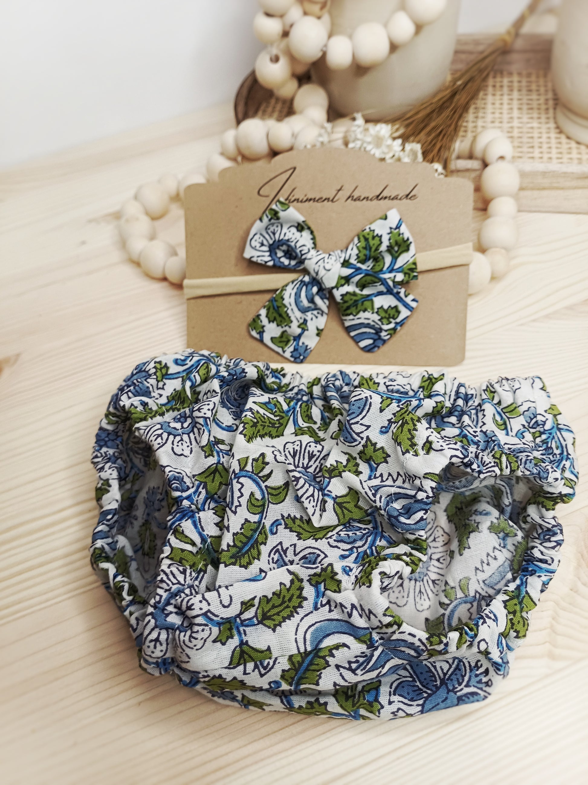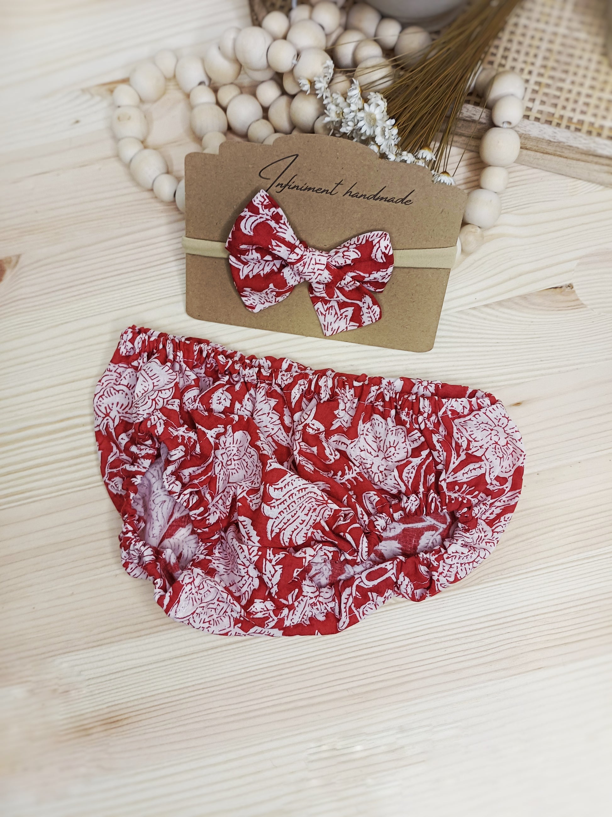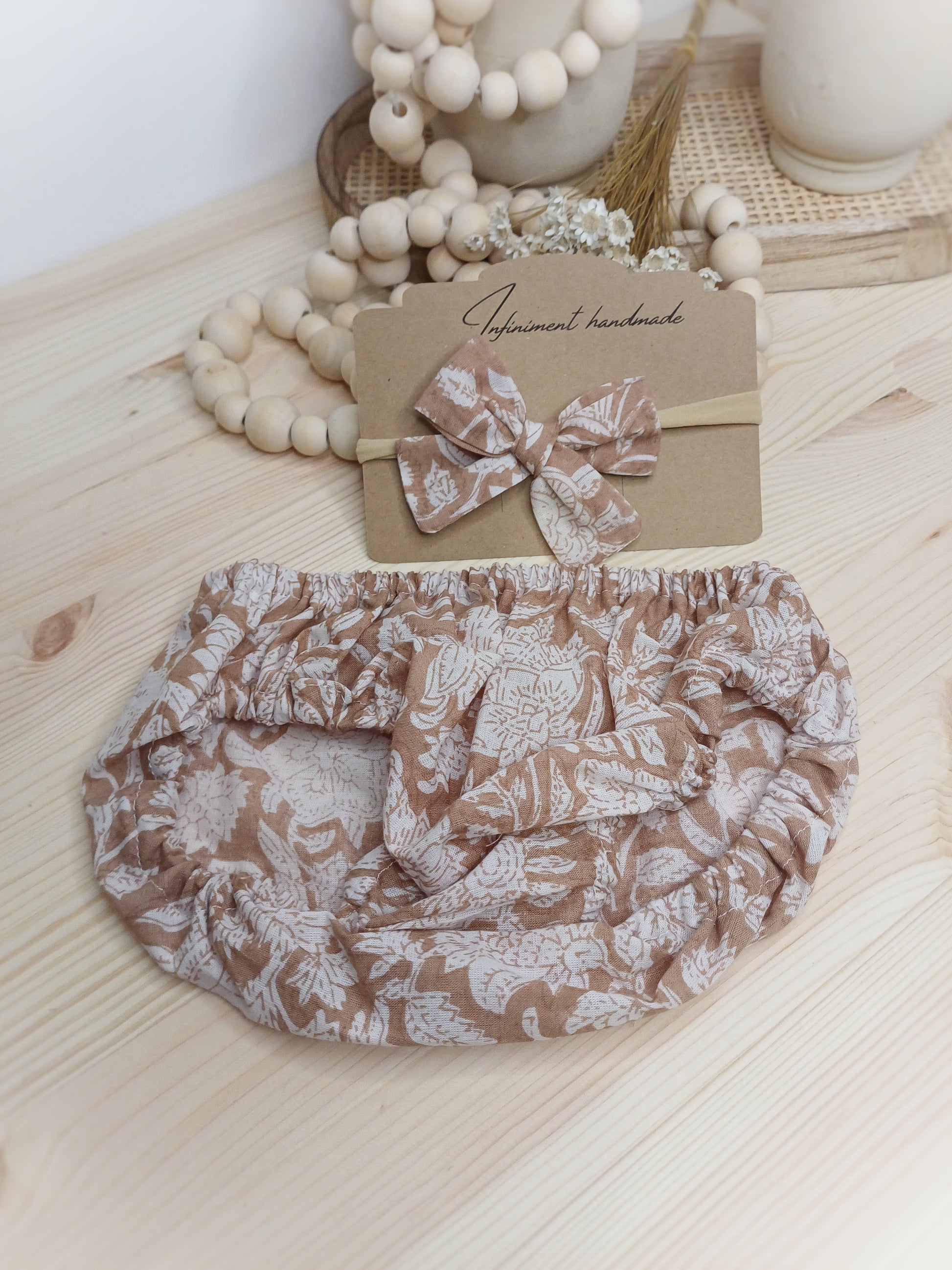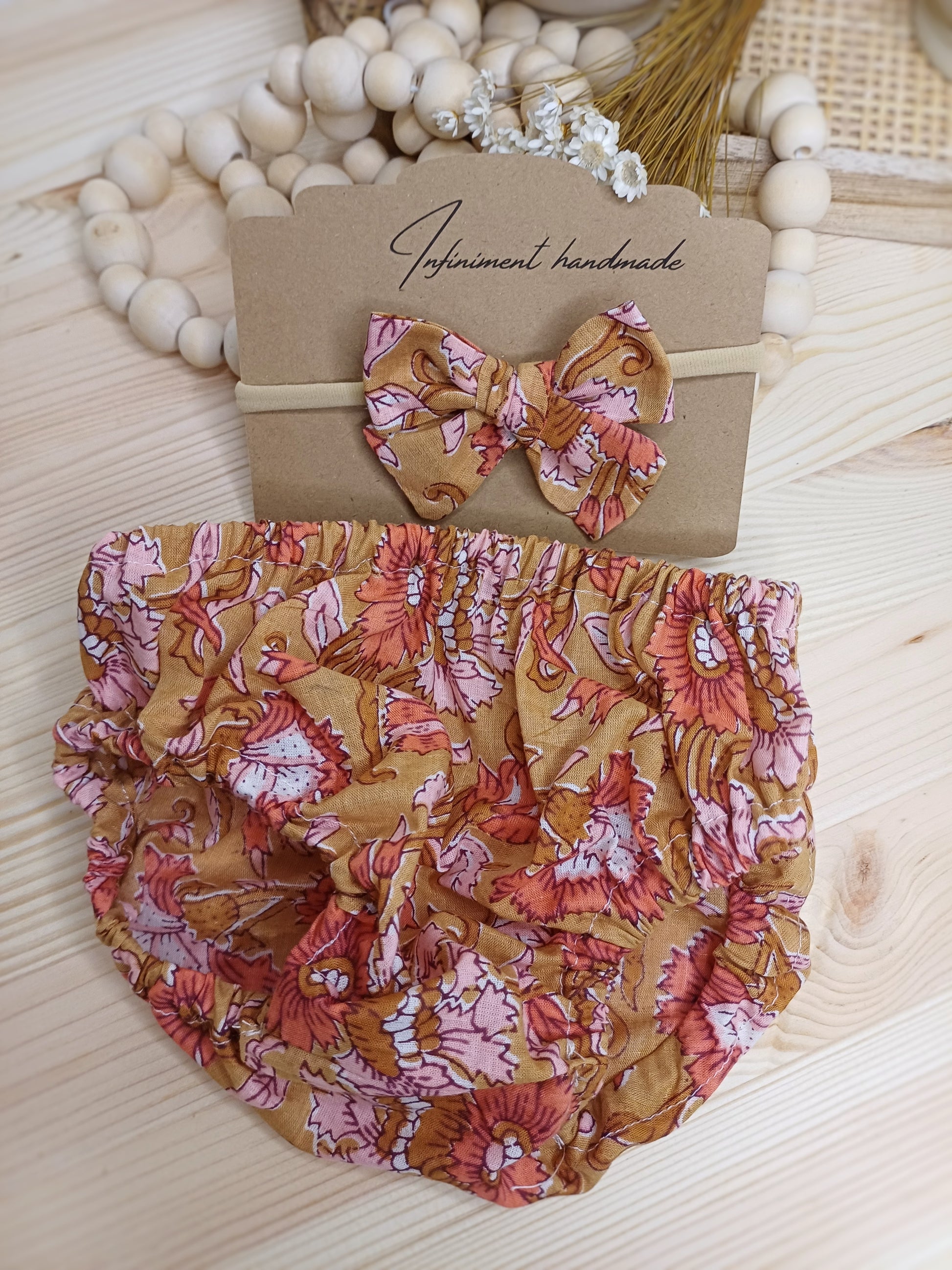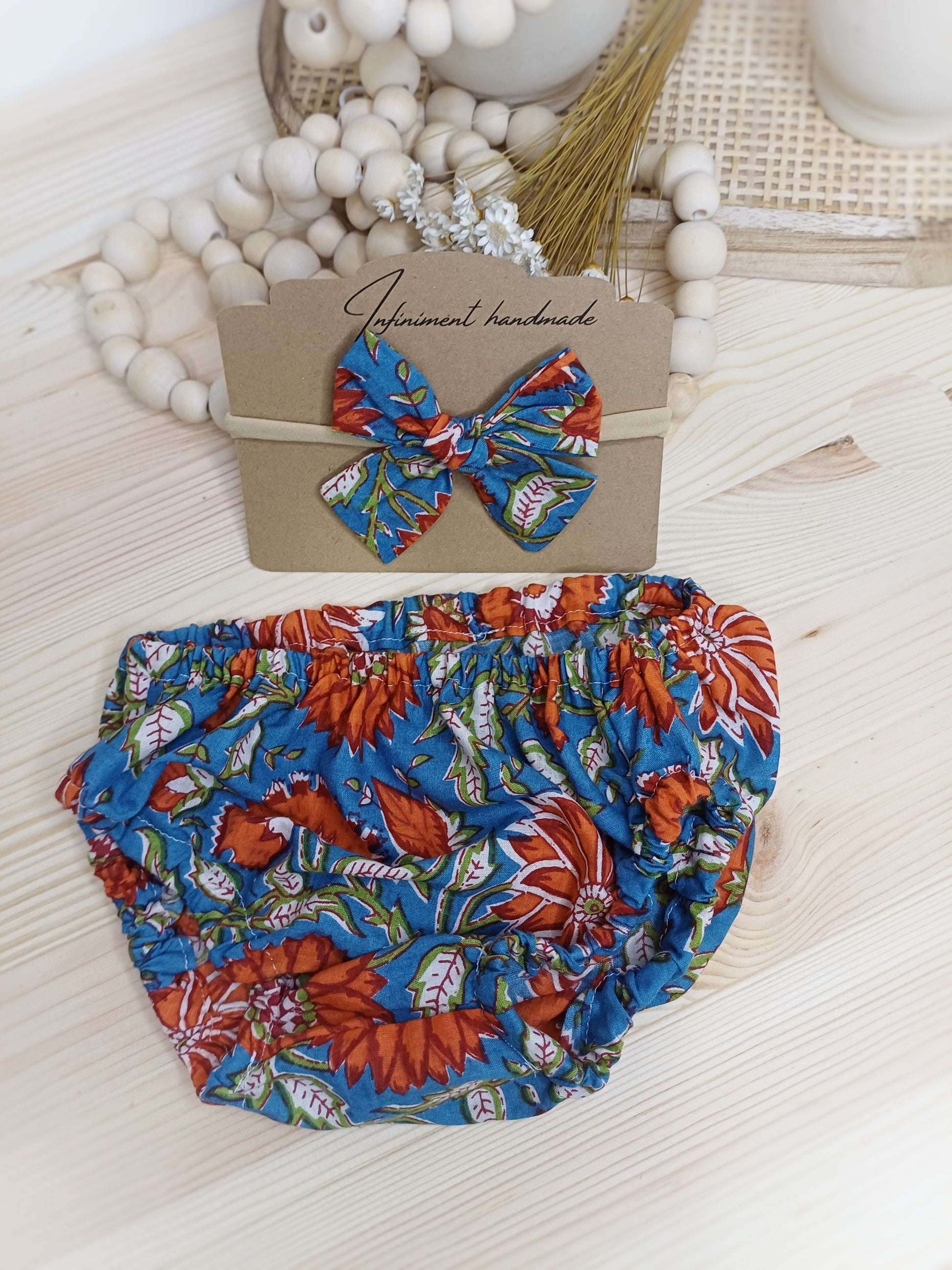 Jyoti est un ensemble plein de tendresse, composé d’une petite culotte bloomer et du petit nœud Keeya assorti, monté sur un bandeau en nylon.
